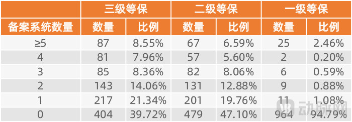 无论是三级保护备案还是二级保护备案,仅有一个系统通过的医院比例是最高的,分别为21.34%和19.76%,加上未通过的比例,意味着有多个系统通过备案的医院比例只有三成左右。