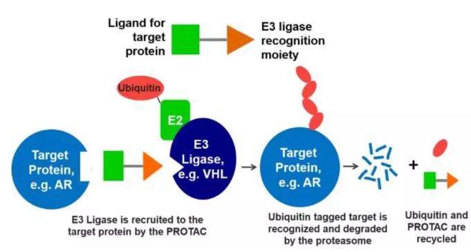 PROTAC(Proteolysis-targeting chimeras,蛋白水解靶向嵌合体)又称靶向蛋白降解技术,是通过泛素—蛋白酶体系统(UPS)诱导靶向蛋白降解的一种全新技术。PROTAC分子能够将E3泛素连接酶募集到靶点蛋白附近,为靶点蛋白打上泛素“标签”。在细胞中,打上泛素“标签”的蛋白将被送入蛋白酶体进行降解。这样,PROTAC分子就能够特异性地促进致病蛋白的降解。