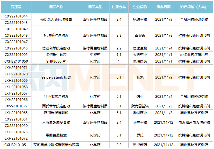 11月1日-11月12日期间,12个新药(21个受理号)的上市申请获得CDE承办。