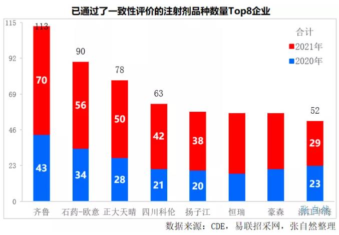 2021年有775个注射剂过评,其中,过评品种数最多的企业依次是齐鲁、石药欧意、正大天晴集团、四川科伦和扬子江等知名大型企业,其在2021年过评的注射剂品种数分别为70个、56个、50个、42个和38个。