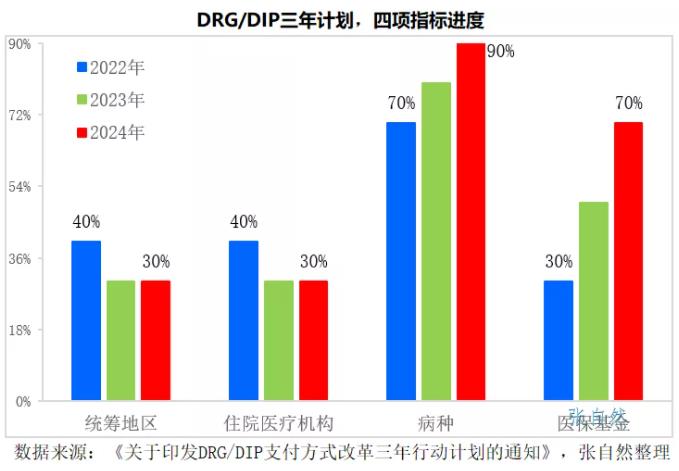 DRG/DIP支付方式改革到2024年底对统筹地区、医疗机构、病种和医保基金的覆盖率要分别达到100%、100%、90%和70%。
