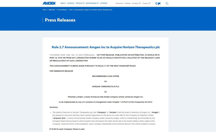 12月12日,安进官方正式宣布将以每股116.5美元的价格收购 Horizon Therapeutics(简称“Horizon”)。“天价”并购消息瞬间刷屏!