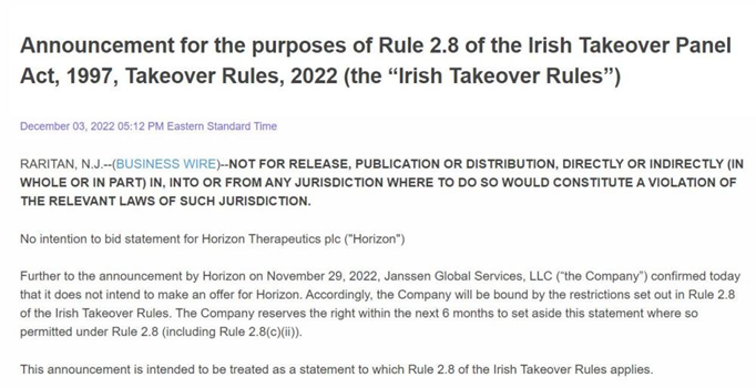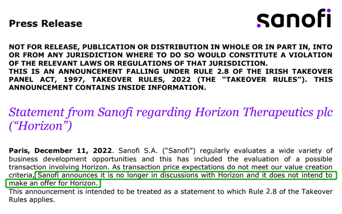 随后,赛诺菲官方发布声明,同样宣布退出参与竞购Horizon ,并表示“交易价格不符合我们的预期”。