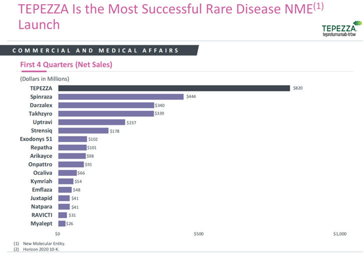 通过并购,Horizon获得了其最有潜力的重磅产品Tepezza,以及一系列罕见病产品,并开启了商业化。Tepezza是由Horizon开发的一款靶向IGF-1R的单抗,于2020年1月获FDA批准上市,成为全球首个治疗甲状腺眼病(TED)的药物。Tepezza在不到1年内即实现了8.2亿美元的销售收入,2021年销售额16.61亿美元。