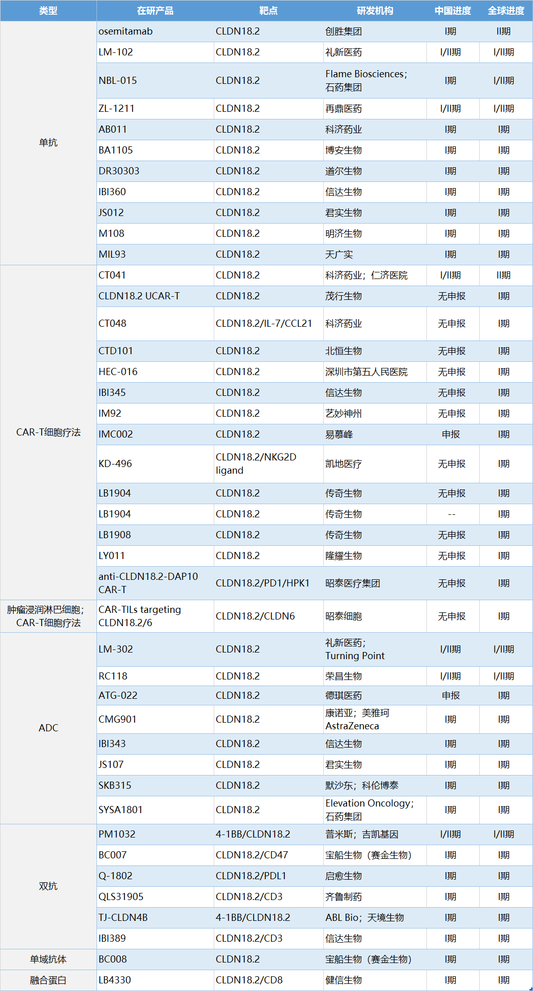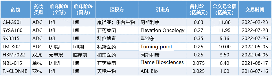 从许可出去的CLDN18.2项目类型来看,ADC似乎更受青睐。这也不难理解,毕竟ADC是时下的热门概念药物,同时在单抗类CLDN18.2药物(zolbetuximab和osemitamab)开发进度遥遥领先的情况下,引入CLDN18.2 ADC更容易实现差异化领先优势。