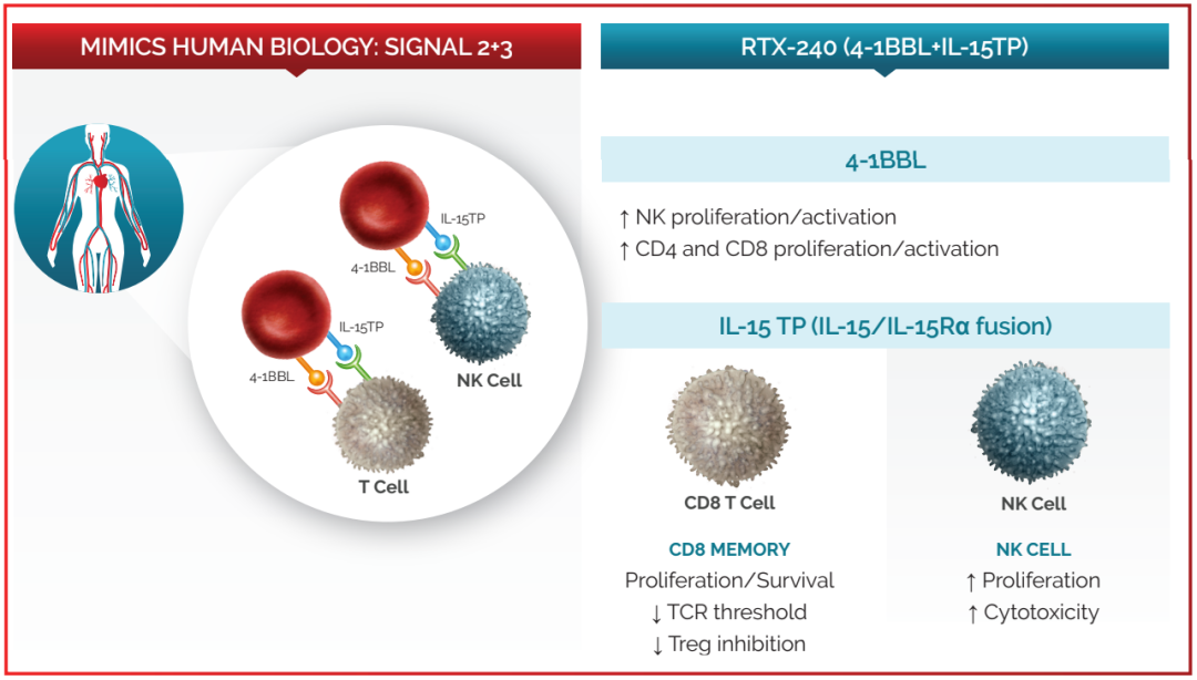 RTX-240,通过基因工程改造,让红细胞表达 4-1BBL 和 IL-15,通过激活 4-1BB 和 IL-15 信号通路,刺激 CD8+T 细胞和 NK 细胞,以产生抗肿瘤免疫反应。正处于1/2期临床试验中。RTX-240 已作为单一疗法给予了36名实体瘤患者,并与派姆单抗(Pembrolizumab,抗PD-1单抗)联合用药给予了14名实体瘤患者。