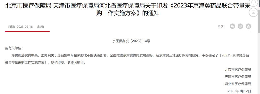 9月18日,北京市医保局官网挂出京津冀三地医保局联合下发的《2023年京津冀药品联合带量采购工作实施方案》的通知。