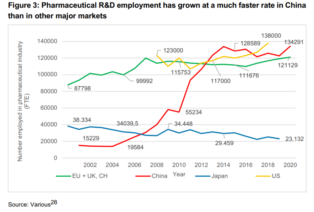 还有一个可喜的观察,有很多美国公司现在来到中国采购项目。从2006年开始,中国制药的R&D技术人员数目是呈倍数增加(大学扩招的结果),2020年中国与美国的R&D人力资源不相上下,而到了2022年,中国制药R&D人力资源数量已经超过美国。