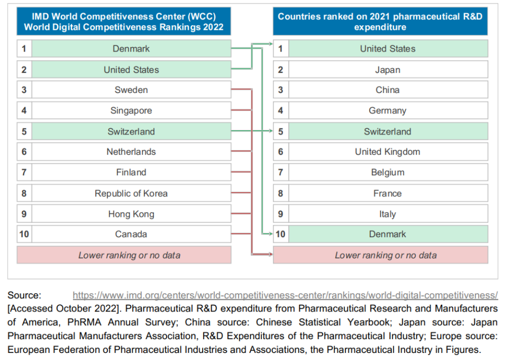 在数字化方面,我们的环境不容乐观。左图是数字化能力排列,右边药物R&D能力排列。美国在数字化方面排名第二,药物研发能力是排名第一。我们的香港在数字化环境中排名在前,但大陆还没有上榜。