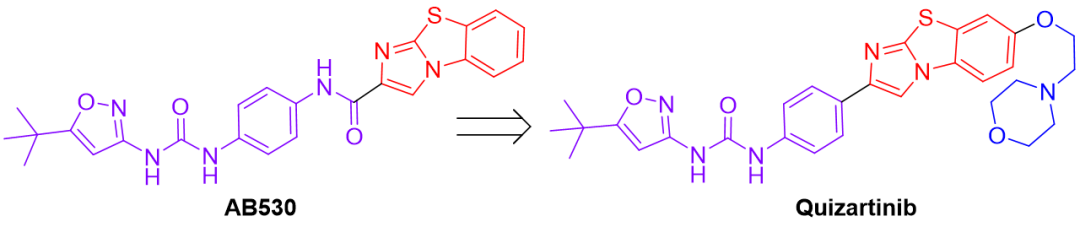 首先通过KinomeScan(Ambit Biosciences公司开发的激酶筛选平台,用于评估小分子与大量激酶活性位点的结合亲和力)对以小型激酶为中心的文库进行分析,得到二芳基脲骨架,简单的苯环取代基SAR后得到活性和选择性都很好(Kd = 1.6 nM)的lead分子AB530。但在较高剂量时,AB530的水溶性和口服PK还需要优化。引入增溶基团并去掉酰胺linker后得到上市药物Quizartinib[2]。