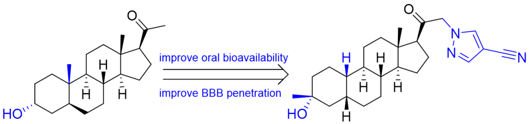 Zuranolone是作为静脉注射神经类固醇brexanolone(也称Allopregnanolone,是一种内源神经类固醇)的改进而开发的,通过去掉C-19、引入吡唑和吸电子氰基,提高了口服生物利用度和入脑渗透性,显著改善了PK。Zuranolone具有适合每日一次给药的生物半衰期(约为16-23小时),而brexanolone的半衰期约为9小时[4]。