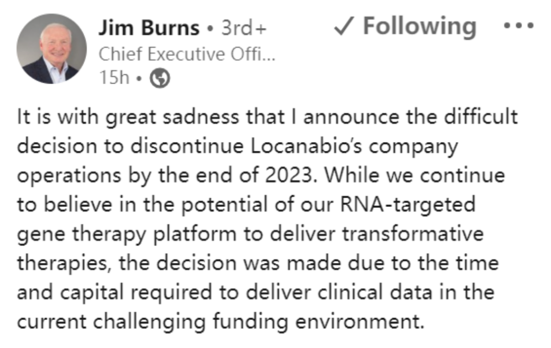 进入11月的第一天,基因疗法生物技术LocanaBio的首席执行官Jim Burns就在在社交平台上发布消息称,该公司将于今年年底前停止运营。