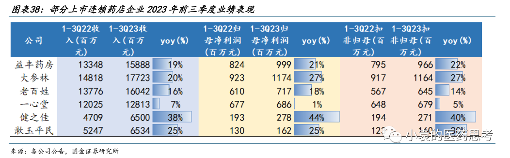 整体来看,上市连锁药店企业2023年前三季度收入和利润增长稳健,但由于各地门诊统筹政策推动速度有区别,局部市场节奏和形势有差异,增长速度有一定差距。