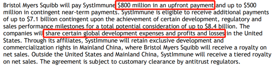 今天被刷屏的新闻无疑是百利天恒与BMS的惊天大交易,虽然中国药企的license-out、特别是在ADC领域已经并不算稀奇,但这个交易的震撼程度仅从金额和条款上就非常超出此前的认知范围:首付款8亿美元+近期付款5亿美元+后续里程碑付款不超过71亿美元(总金额共84亿美元),更重要的是在美国市场双方将共担研发费用和共享收益,在中国市场百利天恒仍然保留权利、并向BMS进行销售额分成,在中美以外区域百利天恒则获得阶梯销售分成。