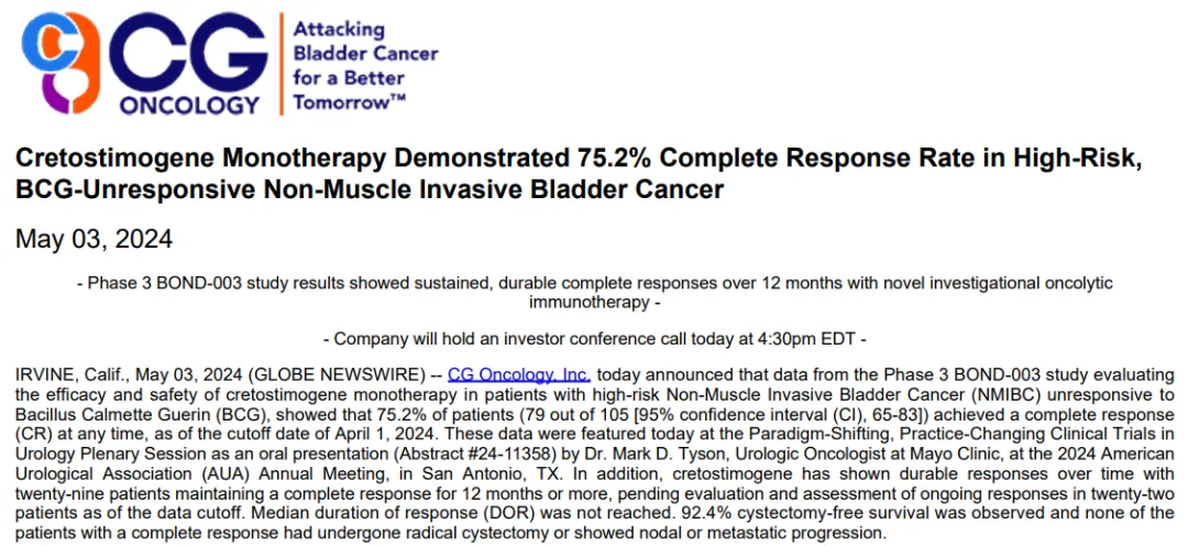 5月3日,CG Oncology宣布,其在研溶瘤病毒疗法cretostimogene(CG0070)单药在治疗对卡介苗治疗无应答、高危非肌层浸润性膀胱癌(NMIBC)患者的有效性和安全性III期研究数据显示,75.2%的患者实现了完全缓解(CR),29例患者维持完全缓解超过12个月。