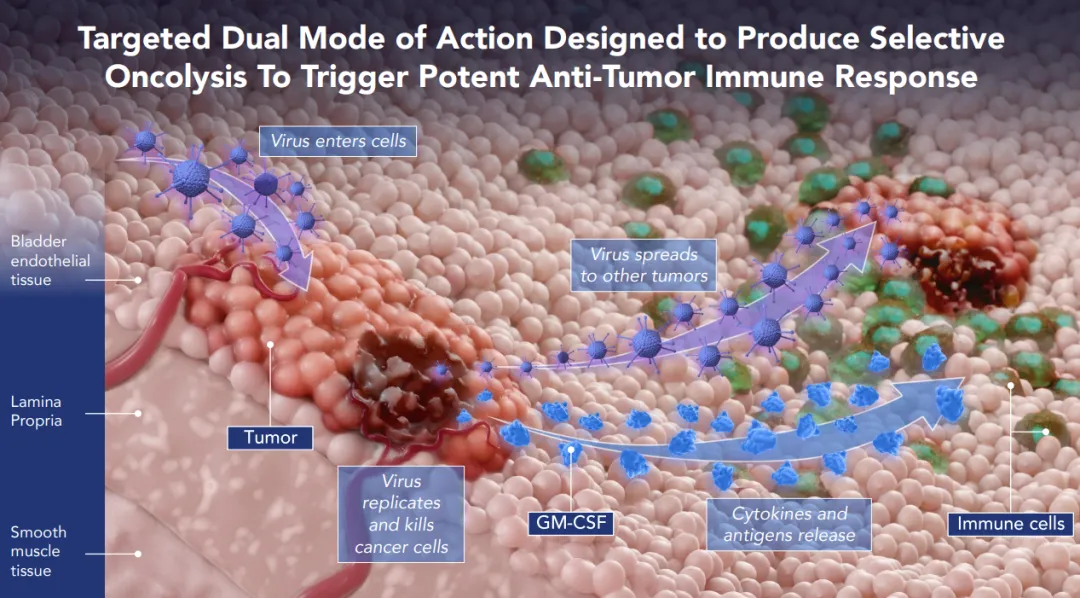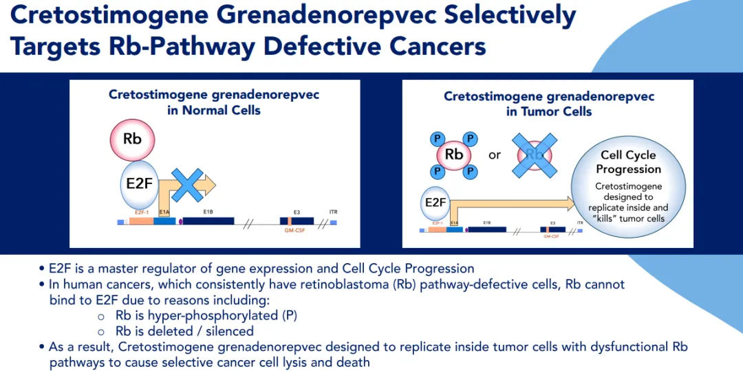 Cretostimogene是一种first in class(FIC)、工程化、条件性复制的溶瘤免疫疗法,通过膀胱灌注给药,其被设计用于在大多数尿路上皮癌中存在的视网膜母细胞瘤(Rb)基因通路缺陷细胞中优先复制,并引发抗肿瘤免疫反应。
