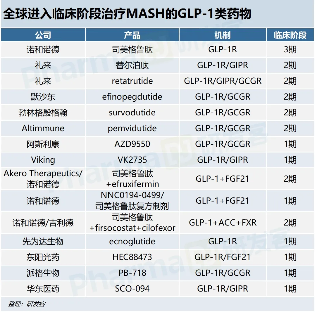 最早涉猎MASH的GLP-1是司美格鲁肽,也是全球进展最快的产品,已启动3期临床。而后再陆续延伸到GLP-1双靶点和三靶点。