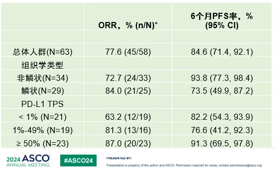 1A队列经过为期14.0个月的中位随访后,ORR为48.6%(18/37, 2例待确认),疾病控制率(DCR)为94.6%,中位PFS为15.4个月(95% CI: 6.7, NE),6个月PFS率为69.2%。1B队列经过为期6.9个月的中位随访后,ORR为77.6%(45/58, 5例待确认),DCR为100%,未达到中位PFS,6个月的中位PFS率为84.6%。1B队列的其他亚组分析如下表所示: