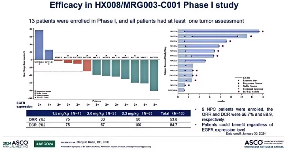 今年ASCO会议上,乐普生物公布了PD-1抗体普特利单抗+MRG003联合治疗的1/2期临床最新数据。截至2024年1月30日,该1/2期临床入组33例患者,一期临床部分包括9例鼻咽癌、1例头颈癌、3例其他实体瘤。二期临床部分包括14例鼻咽癌、6例头颈癌。