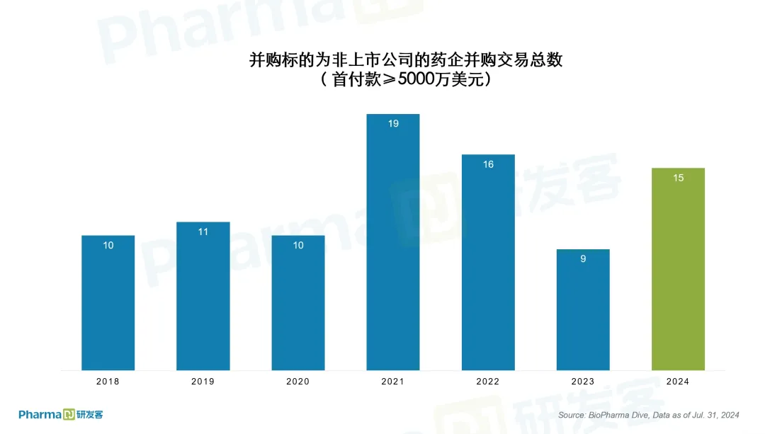 BioPharma Dive的数据显示,截至今年7月底,全球共有28笔首付款超过5000万美元的药企并购交易,其中15笔并购标的是尚未上市生物技术公司。投行 Jefferies 的分析师在上个月的一份研究报告中指出,今年并购初创公司占全部交易的比例是自 2015 年以来任何一年中最高的。