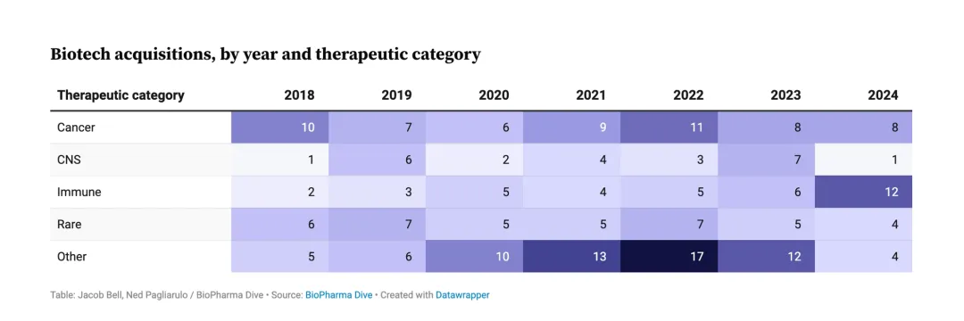 BioPharma Dive的统计数据显示,截至目前,在所有首付款达5000万美元的并购交易中,12笔涉及免疫领域,占总交易的41%。而曾经大热的癌症领域以8笔交易位居第二(见下图)。