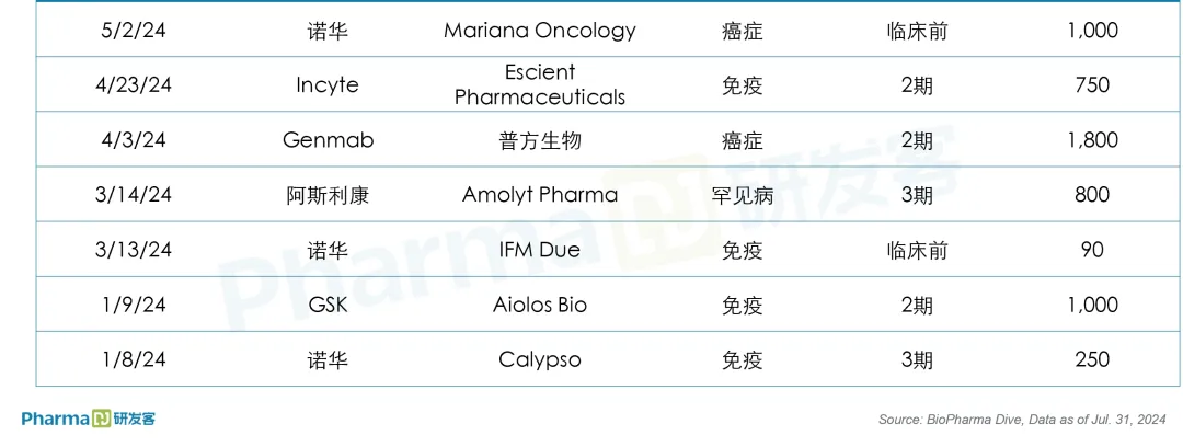 产品方面,跨国大药企热衷的产品开始转向免疫领域,同时也对抗体药物偶联物等新疗法有兴趣。此外,之前因屡屡失败而被大药企放弃的神经科学领域,在2024H1仍未见并购踪影,7月下旬则再次开始吸引买家。