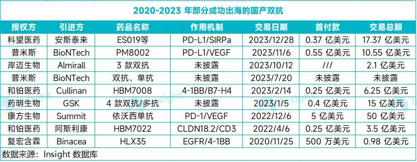这已经不是 PD-(L)1/VEGF 双抗的首次出海。而且,这一交易只是国产双抗爆发浪潮中的一个缩影。根据 Insight 数据库,2020 年至 2023 年,国产双抗 License out 交易总额已达上百亿美元。