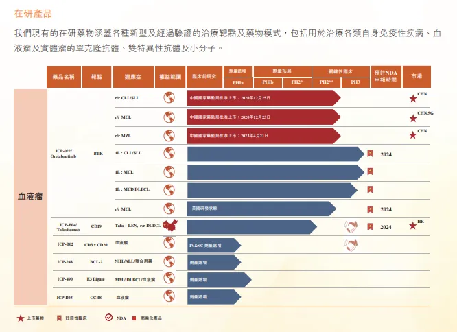 在血液瘤领域,除了奥布替尼正在积极开展一线治疗的临床试验外,还布局了5款不同靶点的临床在研药物,包括Tafasitamab(靶向CD19的单抗)、ICP-248(BCL2抑制剂)、ICP-B02(CD20xCD3双特异性抗体)、ICP-490(CRBN E3连接酶调节剂)等。