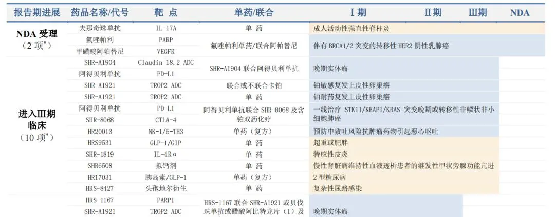 处于Ⅲ期临在研创新药包括肿瘤领域的PD-L1/TGF-β双抗SHR-1701、HER2 ADC SHR-A1811等;代谢领域的胰岛素/GLP-1复方HR17031、长效胰岛素INS068等;风湿免疫领域的URAT1抑制剂SHR4640、IL-5单抗SHR-1703等;眼科领域的阿托品HR19034滴眼液;麻醉镇痛领域的长效局部麻醉药物HR18034;肾病领域的布地奈德缓释胶囊、拟钙剂SHR6508;妇科领域的GnRH受体拮抗剂SHR7280;抗感染领域头孢地尔衍生物HRS-8427等。
