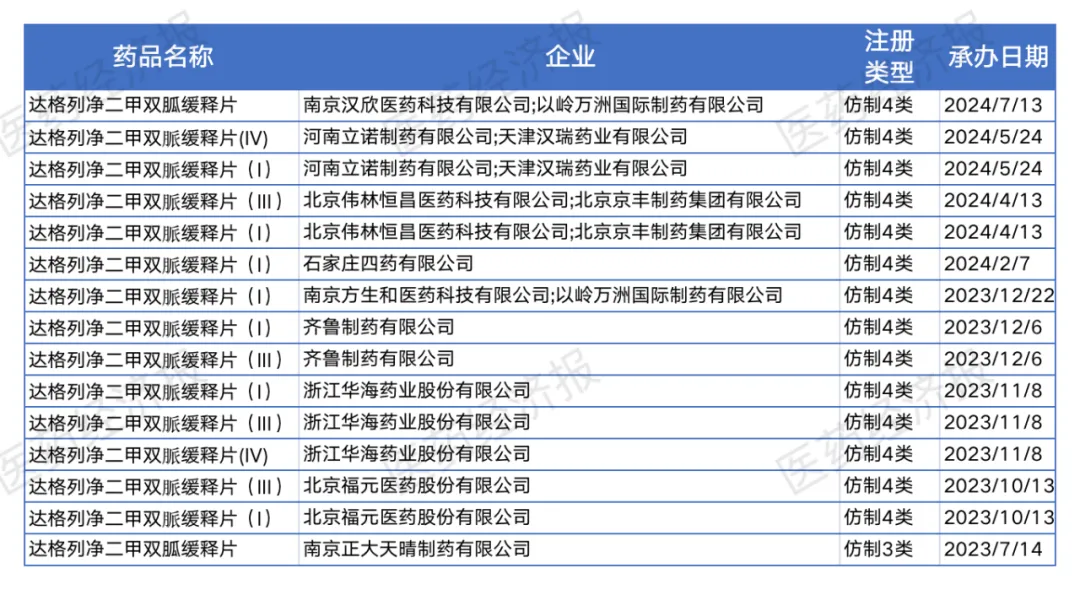 作为糖尿病赛道当中的明星产品,达格列净二甲双胍缓释片在国内已有众多企业布局。除宣泰医药此番获批外,另有正大天晴、华海药业、齐鲁制药、石家庄四药等9家企业已提交达格列净二甲双胍缓释片仿制药的上市申请。