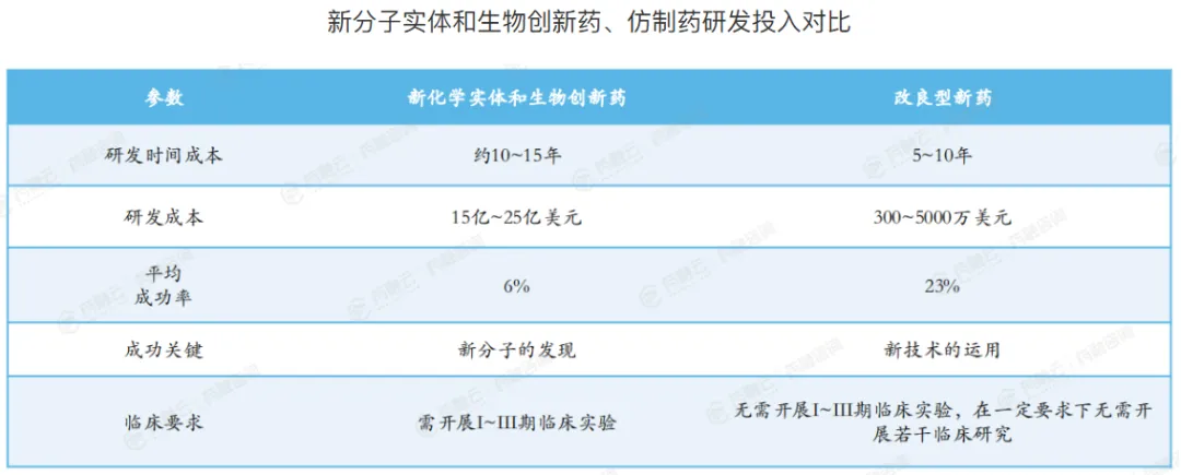 相比1类新药而言,2类改良型新药拥有更高的研发成功率、较短的开发时间和更低的开发成本,成为各大老牌药企转型创新的风口,当然由于是非完全原创性的新药,创新含量也相对不足。