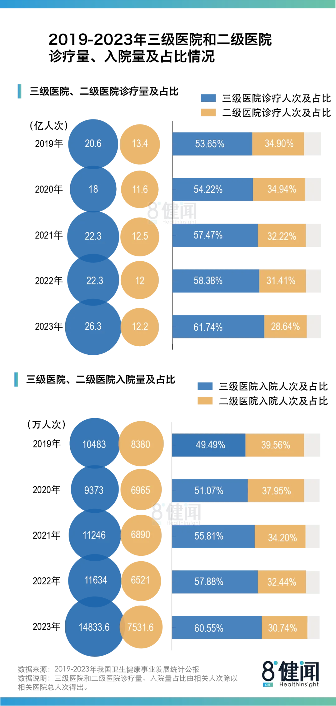 2023年的《卫生统计公报》传递出一个信号:三级医院的服务体量持续扩大,二级医院的服务体量在不断萎缩。