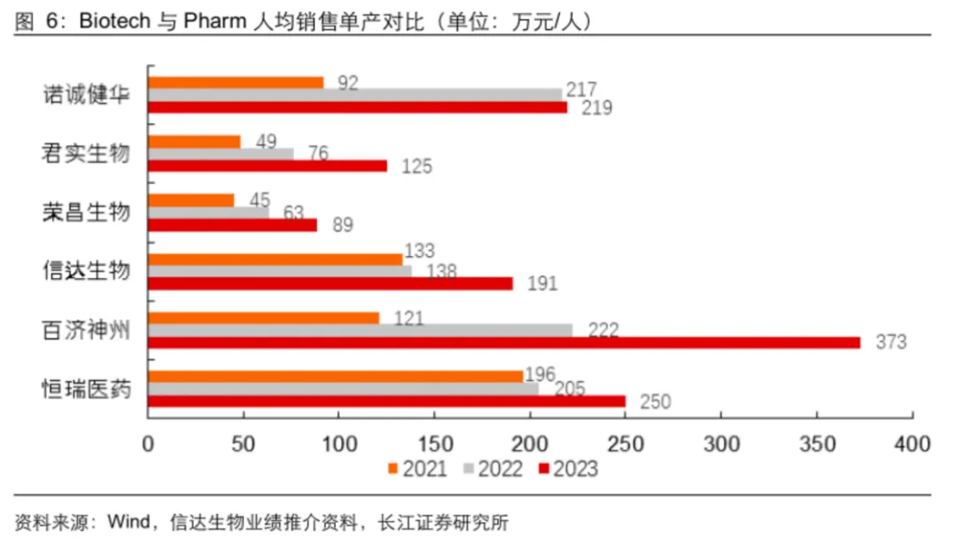 耐赋康®惊人的放量速度是这种模式的最佳背书。2024上半年耐赋康®实现销售收入1.673亿元,而耐赋康®截至2024年6月底的商业化时间仅1个半月,商业化团队不过一百多人。按照云顶新耀全年业绩指引来看,耐赋康®全年销售大概率超过3亿元,届时耐赋康®销售团队人均销售额大概率在200万元以上,这已经超过了国内大部分Biopharma,向着恒瑞医药这样以商业化见长的国内大药企逼近。