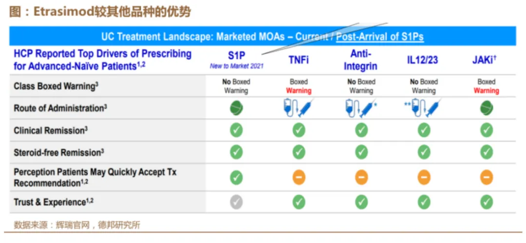 伊曲莫德是口服小分子选择性1-磷酸鞘氨醇S1P受体调节剂,用于治疗溃疡性结肠炎(UC)。至今为止,2024年已经完成了多笔炎症性肠病(IBD)的M&A,原因在于其不可治愈、终生复发性,是孕育重磅炸弹的适应症温床(中国2025年IBD患者预计达150万人)。从各个治疗方案的3期临床研究数据中,观察到伊曲莫德的临床缓解率极具竞争力,有望成为常规治疗失败后的首选口服治疗药物。相较于现有常规治疗手段,伊曲莫德具备成本低、依从性高、疗效&安全性优良的特点,机构预计伊曲莫德仅国内销售峰值可达20亿元。