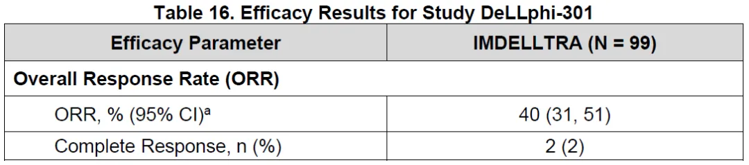 两款药物都已取得充分临床数据验证,并在同类药物竞争中处于领先身位。安进的Imdelltra在今年5月获FDA批准上市,成为首款获批的DLL3/CD3双抗。在其DeLLphi-301临床中,99例患者ORR为40%,mDoR为9.7个月。