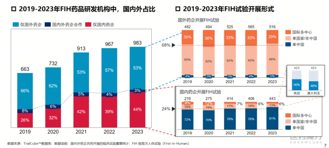 2019-2023全球FIH试验研发机构分布及开展形式统计(来源:医药魔方TrialCube数据库)