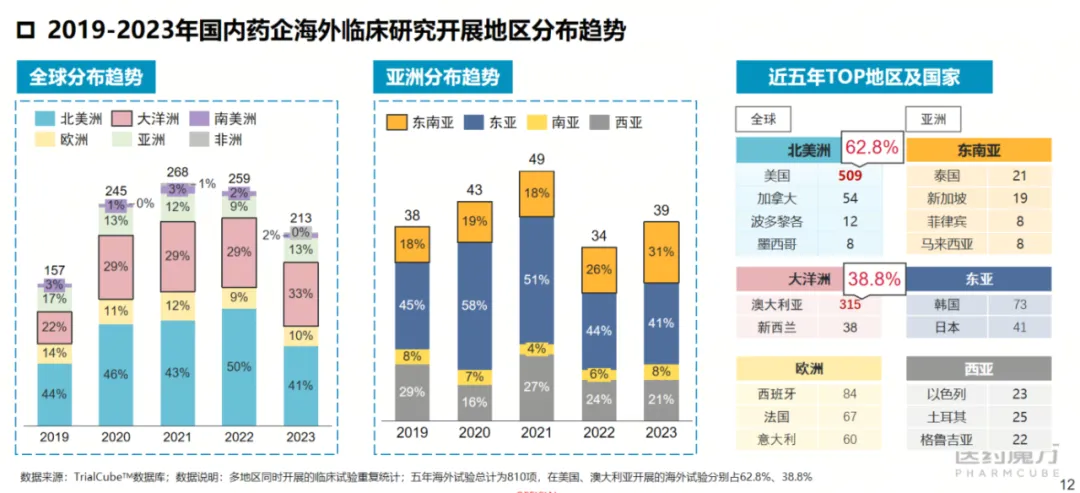 2019-2023国内药企海外临床研究开展地区分布趋势(来源:医药魔方TrialCube数据库)