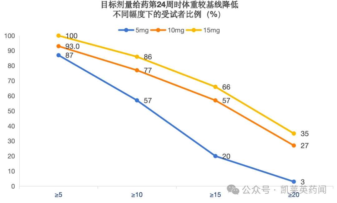 给药第24周时,5mg组、10mg组和15mg组体重较基线降低≥5%的受试者比例分别为87%、93%和100%;体重较基线降低≥10%的受试者比例分别为57%、77%和86%;体重较基线降低≥15%的受试者比例分别为20%、57%和66%;体重较基线降低≥20%的受试者比例分别为3%、27%和35%。