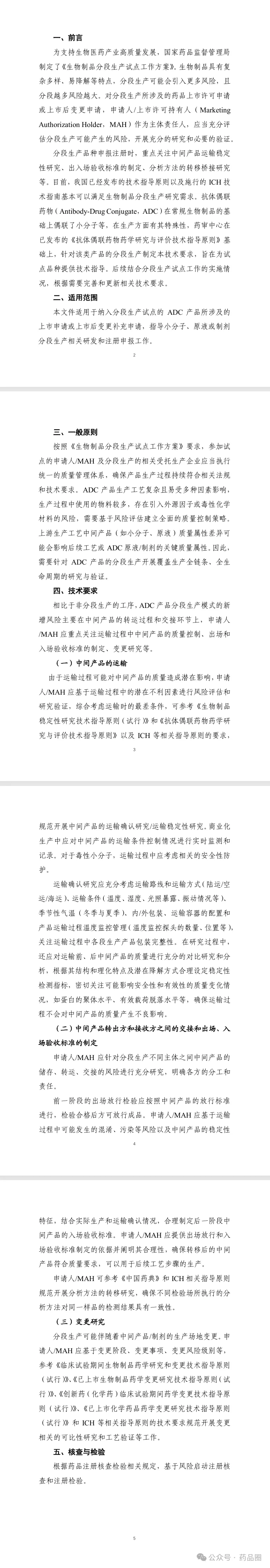 由于抗体偶联药物(Antibody-Drug Conjugate,ADC)在常规生物制品的基础上偶联了小分子等,在其结构、生产等方面具有一定的特殊性。为配合分段生产试点工作的开展,药审中心在已发布的《抗体偶联药物药学研究与评价技术指导原则》基础上,组织制定了《抗体偶联药物分段生产试点注册申报技术要求》(见附件)。根据《国家药监局综合司关于印发药品技术指导原则发布程序的通知》(药监综药管〔2020〕9号)要求,经国家药品监督管理局审查同意,现予发布,自发布之日起施行。