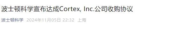 近日,据波士顿科学官微信息,波士顿科学公司宣布已签订Cortex, Inc.收购案的最终协议,本次收购案预计将在2025年上半年完成交易,具体条款尚未披露。
