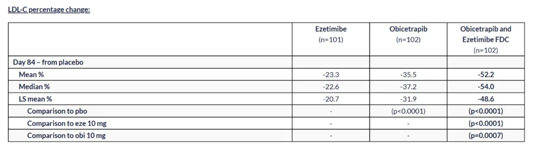 该试验的共同主要终点是:在第84天时,固定剂量复方药物组与单一疗法组相比,LDL-C水平与基线相比的百分比变化,以及obicetrapib(10 mg)组与安慰剂相比,LDL-C水平与基线相比的百分比变化。次要终点包括其他生物标志物与基线相比的百分比变化,如脂蛋白(a)、非高密度脂蛋白胆固醇和载脂蛋白B。