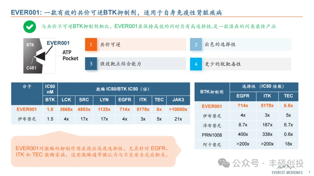 EVER001之所以在同类竞品中脱颖而出,在于其共价可逆的设计以及出色的选择性,既保持强效的靶点结合能力,也减少了脱靶毒性。