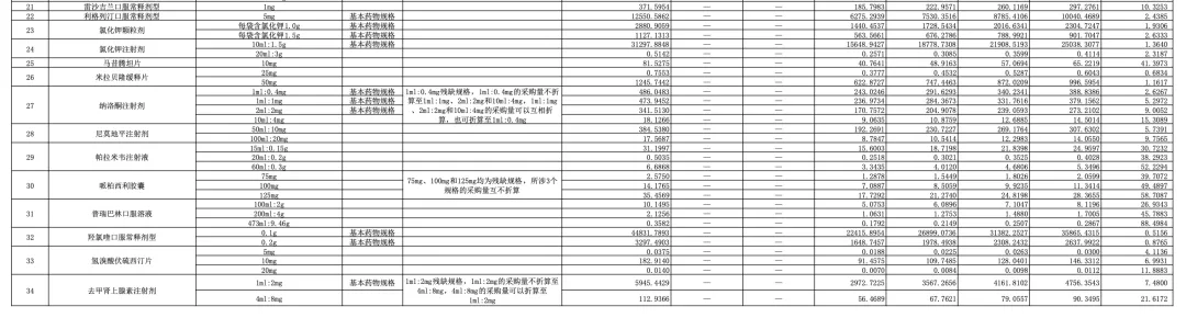 按照首年约定采购量计算基数对应的金额规模看,100mg阿司匹林口服常释剂型(不含分散片)(<300mg)最大,超过18亿元,集采后相应金额规模将下降至8亿元左右;1ml:2mg的去甲肾上腺素注射剂对应金额在9.6亿元,集采后预计下降至4亿元附近。