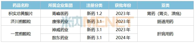 青峰医药的枳实总黄酮片是天然胃肠动力药,用于治疗功能性消化不良。济川煎颗粒和一贯煎颗粒是按古代经典名方目录管理的中药复方制剂,济川煎颗粒用于肾虚便秘证,目前为康缘药业的独家产品,一贯煎颗粒主治肝阴不足,血燥气郁证,目前已有两家药企获批。