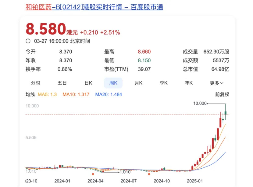 医药板块里最大的“明星”无疑是和铂医药,年初以来其股价开始飙升,股价从不到2港元左右涨到了今天的8港元以上,涨幅近500%。这正是祥峰投资2018年入手的标的,持有将近7年,期间股价经历了“过山车”。“祥峰投资内部经过了反复讨论,但基于对和铂平台技术的信心,一直没有放弃。”刘天然透露。