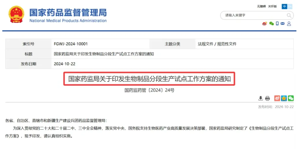 2024年10月22日,国家药监局发布《生物制品分段生产试点工作方案》。同年11月7日,国家药监局药品审评中心发布了《抗体偶联药物分段生产试点注册申报技术要求》(2024年第47号通告 ),为抗体偶联药物(ADC)为代表的复杂药物,分段生产试点注册申报工作提供了关键的技术指引。