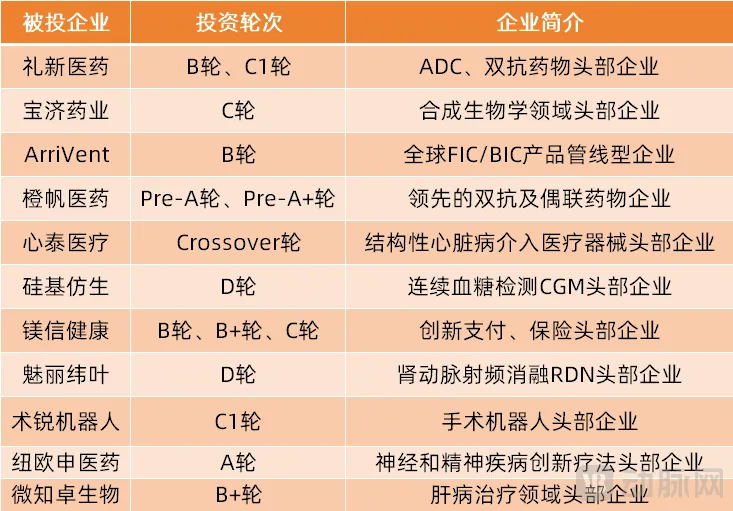 除了早期项目外,上实资本的被投企业名单中细分领域头部企业的占比也较高。如礼新医药、宝济药业、ArriVent、橙帆医药、纽欧申医药、乐普心泰、硅基仿生、镁信健康、魅丽纬叶等。