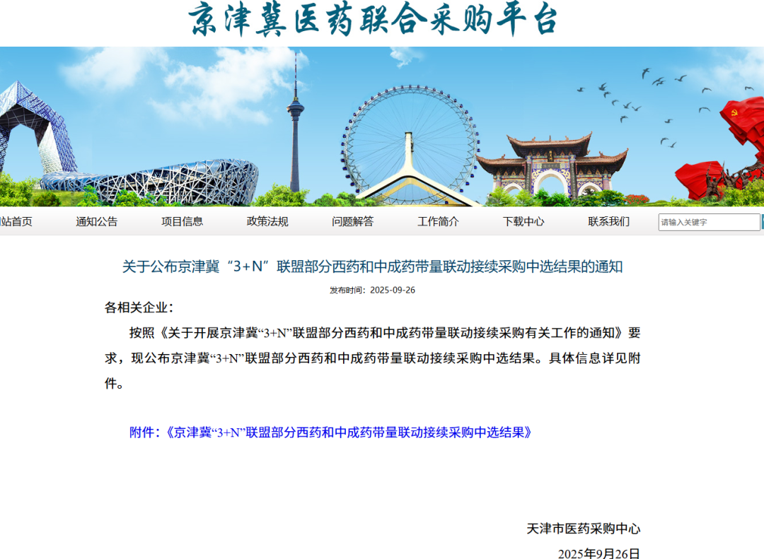 9月26日,天津市医药采购中心发出《关于公布京津冀“3+N”联盟部分西药和中成药带量联动接续采购中选结果的通知》,公布了京津冀“3+N”联盟部分西药和中成药带量联动接续采购中选结果。