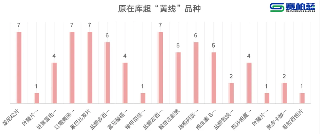 具体来看,原在库超“黄线”品种按超黄线幅度降序排列,其中泼尼松片、红霉素肠溶片、苯巴比妥片、盐酸左西替利嗪口服滴剂已经被点名7次。