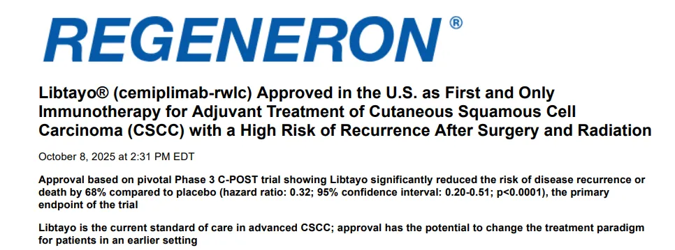 FDA 的批准是基于关键性 Ⅲ 期试验 C-POST 的数据,该试验旨在评估 Libtayo 与安慰剂相比,用于治疗术后和放疗后复发风险较高的 CSCC 患者的疗效和安全性。C-POST 研究结果已发表于《新英格兰医学杂志》,并在 2025 年 ASCO 年会上进行了报告。